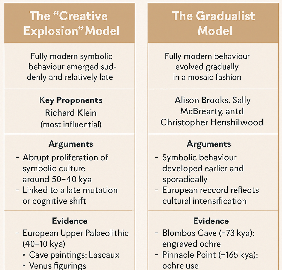 The debate over the origin of modern symbolic behaviour is central to understanding human evolution. Scholars broadly fall into two explanatory models: